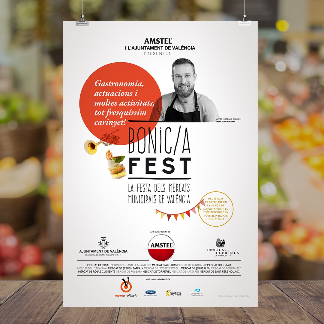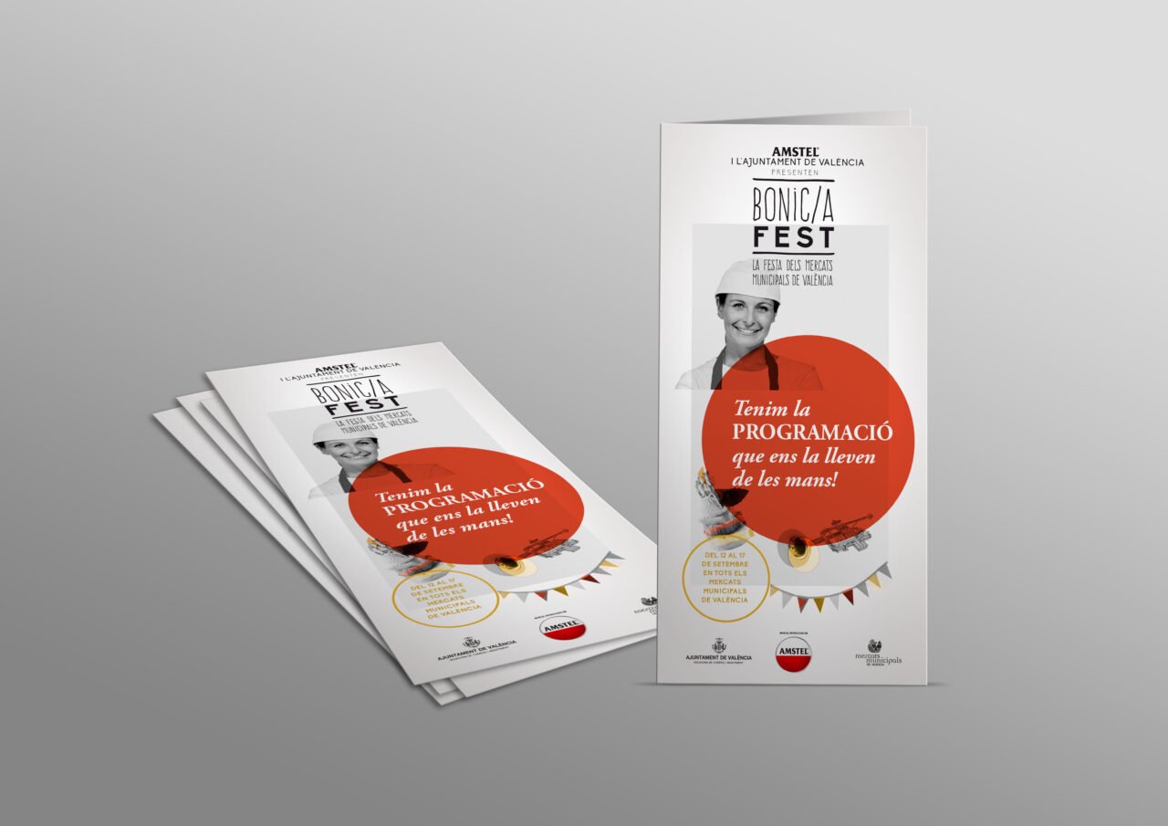 El Bonic/a Fest fue una iniciativa del Ayuntamiento de Valencia para atraer a nuevos públicos a los mercados municipales combinando gastronomía y música en una gran fiesta nocturna. La imagen y la campaña de la primera edición corrieron a cargo de Serviceplan –entonces Publips–, que confió en mi para crearlas. Nuestra apuesta fue mostrar a los grandes protagonistas de los mercados, los tenderos, así como elementos festivos y gastronómicos. La marca, inspirada en los rótulos manuscritos de las propias paradas, se mantuvo durante las cuatro ediciones del festival.