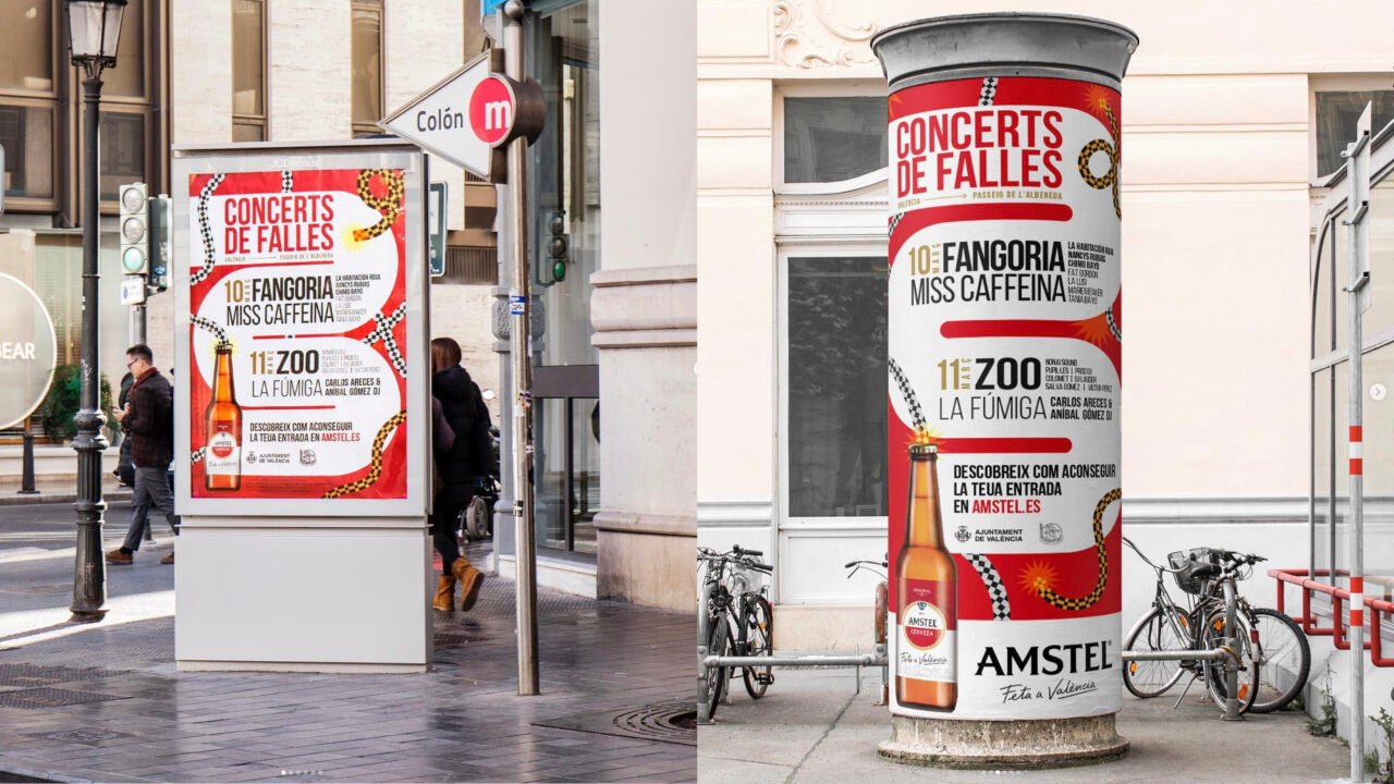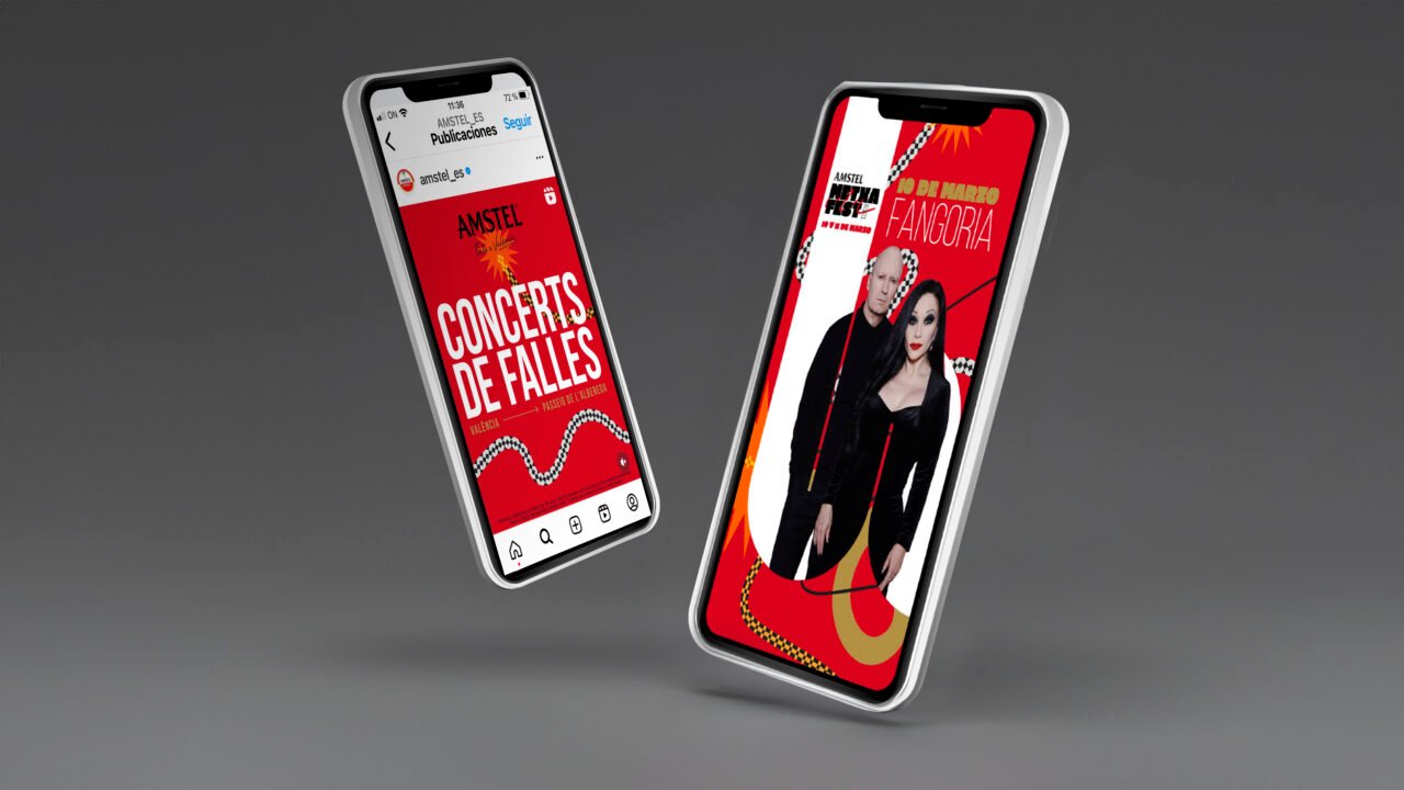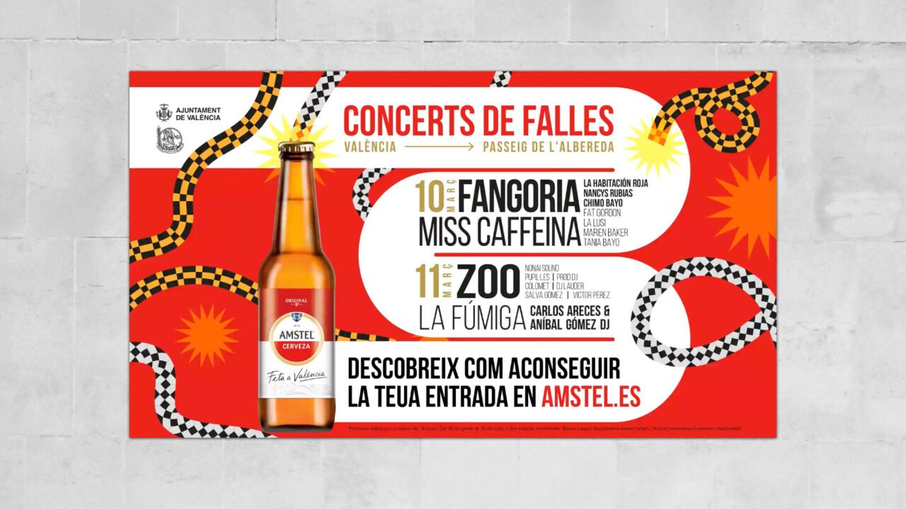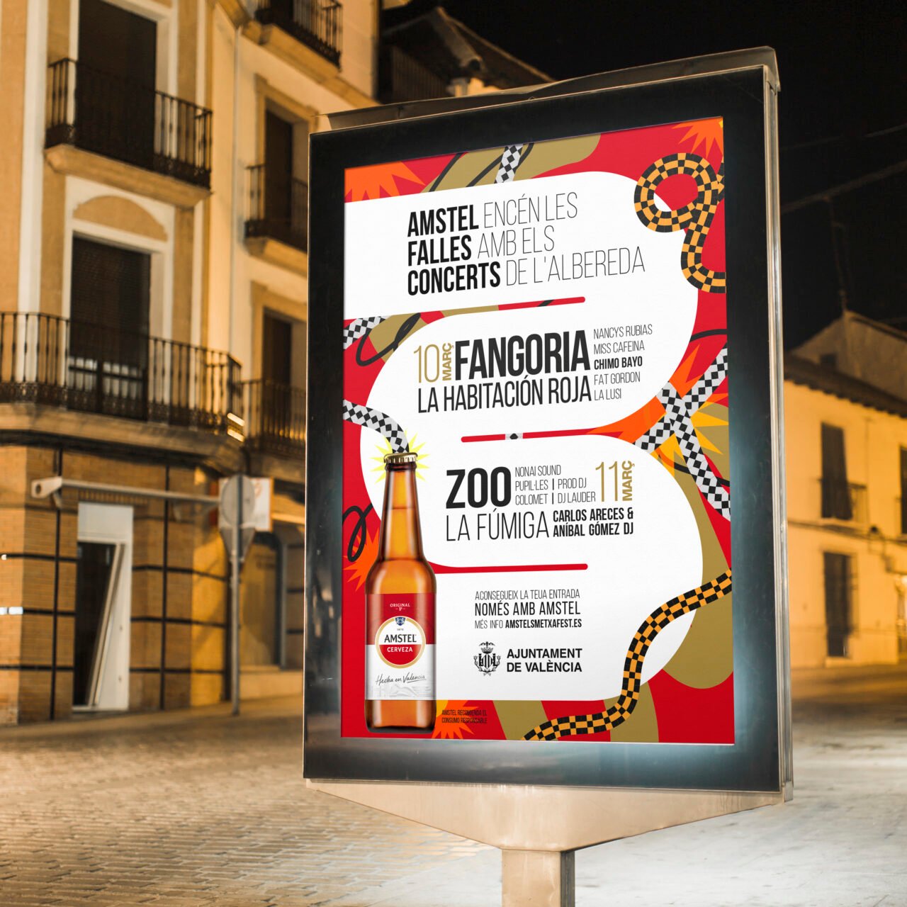 Desde hace más de una década, Amstel trabaja su vinculación con Valencia durante la fiesta de las Fallas con un evento que se ha convertido ya en tradición: el Conciertazo de Amstel. Para crear su identidad visual en 2022, partí de la imagen de la mecha con la que se encienden los petardos en Fallas. El resultado fue un universo gráfico muy Amstel, muy fallero y por supuesto muy versátil para adaptarse a la gran cantidad de soportes con los que cuenta siempre la campaña.