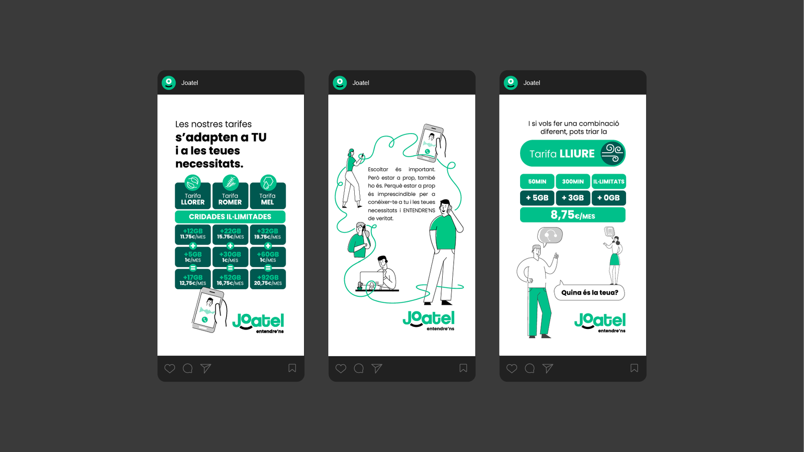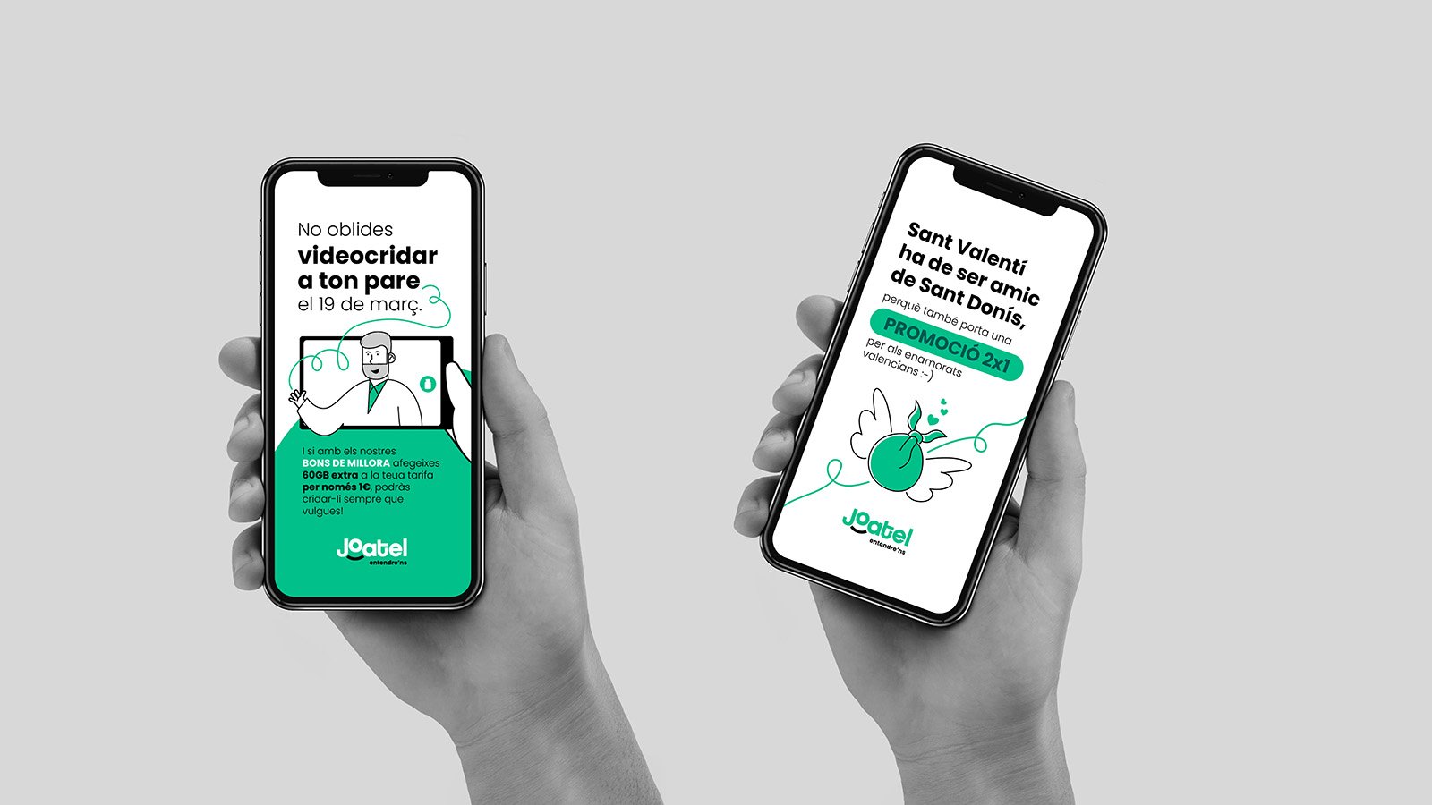 Joatel es una operadora telefónica de la comarca valenciana de la Ribera Baixa. La cercanía y el entendimiento con el cliente es su gran fortaleza, en contraposición con las grandes operadoras. El diseño de la marca tenía que transmitir esta proximidad y, a la vez, cierta rotundidad para dejar claro que se trata de un servicio profesional. La identidad, con ilustraciones de trazo y mensajes en valenciano, transmite también el entendimiento y la facilidad a la hora de contratar sus servicios.