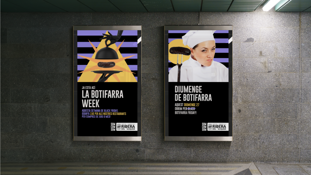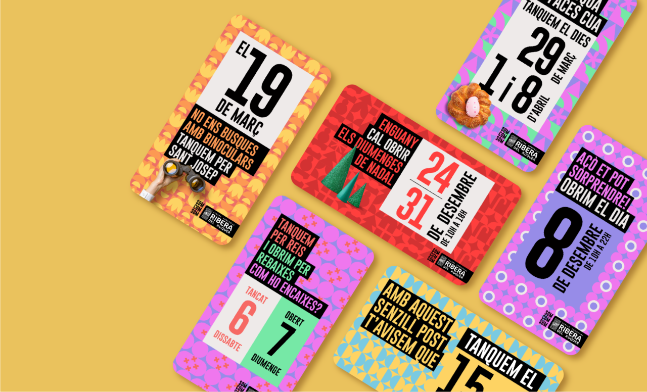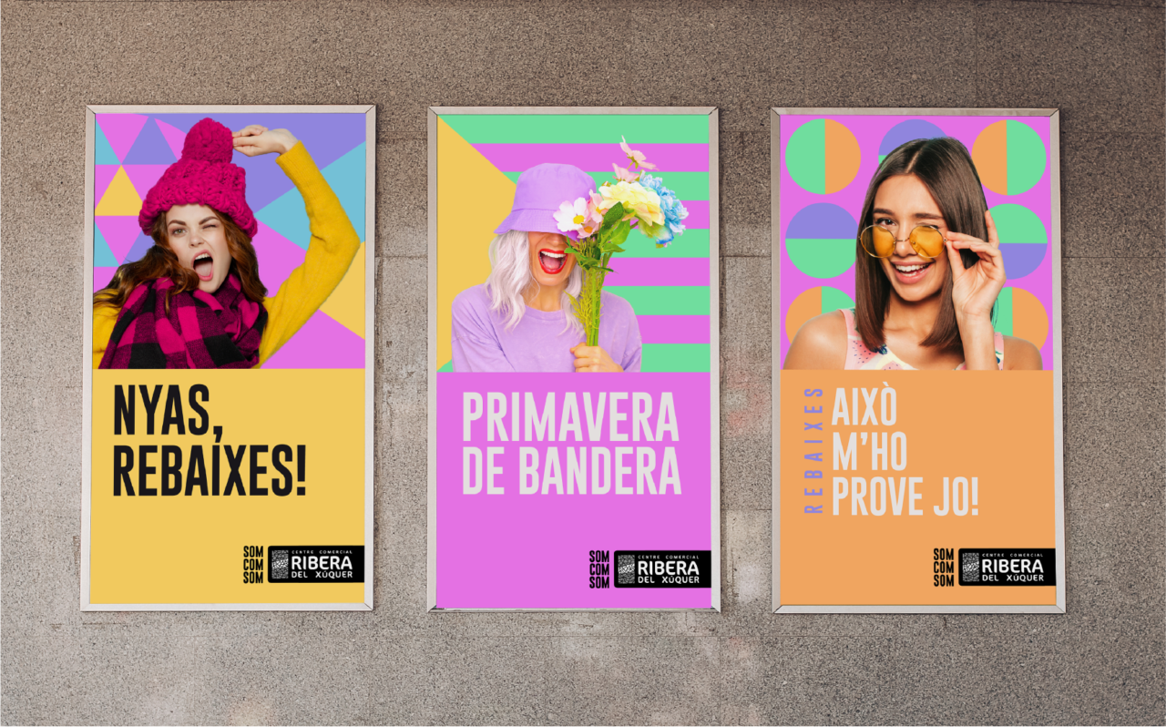 Un posicionamiento como el de Ribera del Xúquer tiene un gran recorrido, pero los años no pasan en balde. Sin renunciar a la identidad valenciana del centro comercial, planteé una evolución gráfica con colores pastel y nuevos recursos gráficos basados en formas geométricas. Más fresco y más actual, igual de divertido.